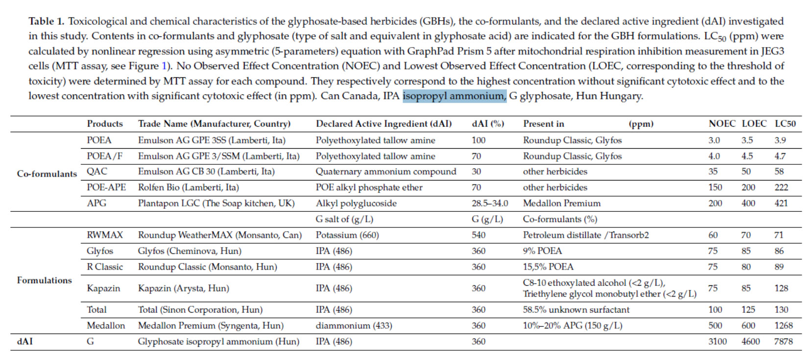 Sin embargo, las investigaciones de Mesnage et al. (2013) y Mesnage et al. (2014) muestran que esos coadyuvantes en conjunción con el principio activopueden ser hasta 1000 veces más tóxicos que el principio activo considerado de manera aislada en la dosis aceptable diaria.